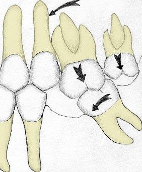 Teeth are arranged in a specific way to keep their position stable, in function and healthy. When teeth are extracted, this stability is compromised. Arches are stable forms in nature and it is no mistake that teeth happen to be set up in such a way. Yet when a tooth is removed from the arch, the resulting space allows teeth to move. Teeth reside in a living, growing and dynamic body tissue called bone. Given adequate time, the growth and change of this bone can cause teeth to tip, erupt out of the bone and spread apart. Teeth have a natural tendency to drift to the midline of the arches. This ensures that spaces do not occur between the teeth. Such spaces are detrimental to a person in that food is impacted between and it can irritate gum tissue. The illustration to the left shows how, given enough time, the remaining teeth can shift and drift when a lower first molar is lost. Such shifting takes time, but 10 to 20 years can, and often does, result in the situation pictured here.
