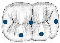 This top (or occlusal) view of a lower first molar illustraes the large surface area that such teeth have to support the forces generated by the human jaws. The blue dots indicate where the opposing tooth's cusp tips contact on this tooth. Fossae, or depressions in the surface accept the opposing tooth's cusp. Indicated by the blue points down the center. The blue points on the cusp tips mesh with the opposite tooth's fossae. This scheme works very well and is very stable. It is produced when the teeth are in an ideal position. Tooth loss and subsequent movement often disrupts this contact pattern.
